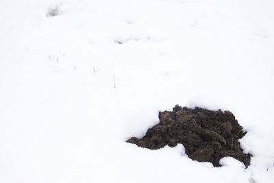 Nu ik het toch over grond heb… Ik heb altijd gedacht dat mollen aan winterslaap deden, maar dat is verre van waar. Er verschijnen hier zelfs molshopen in de sneeuw. Vanmorgen riep Isabelle (7) dat ze een molshoop zag bewegen. De grond wiebelde en kwam verder omhoog. Aan het spoor van molshopen te zien gaat deze mol richting de moestuin.